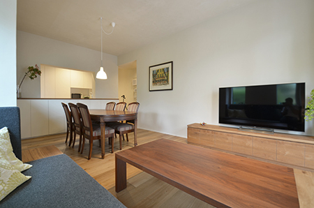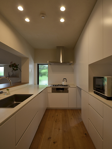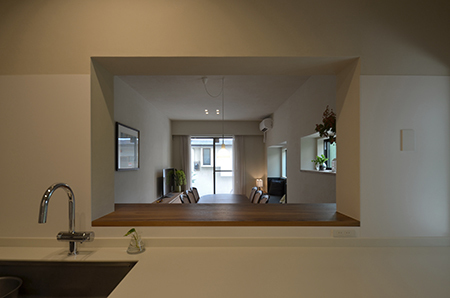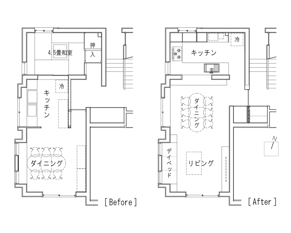 戸建て二世帯住宅のキッチン廻り改修のご依頼でした。隣接して、あまり使っていないという和室があったのでキッチンはそこへ移動し、対面する形となるリビングダイニングはゆったりとした空間とすることをご提案。また、手をつけることができない既存の窓位置やニッチ部分なども、新プランで有効活用できるよう心がけて設計しました。