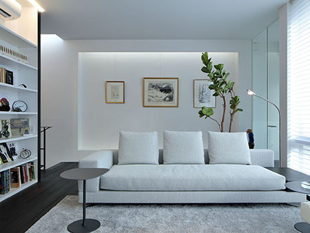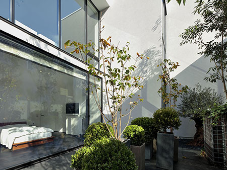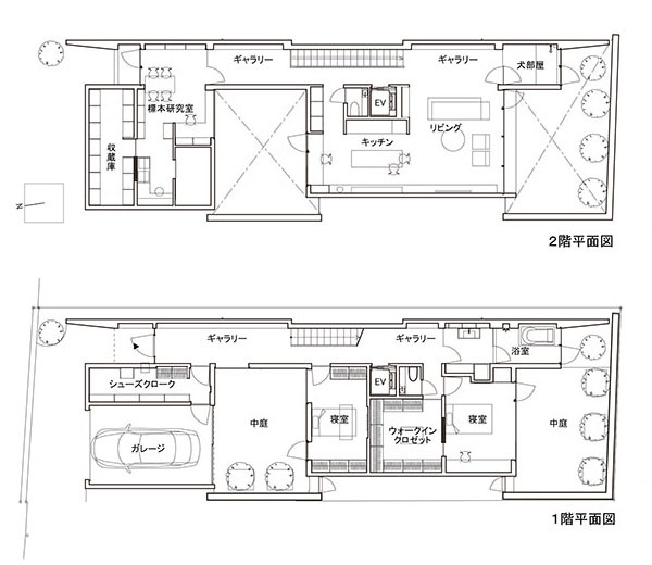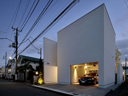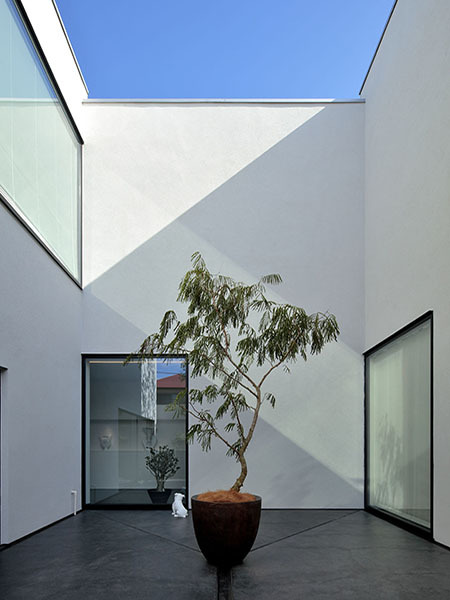 「南北に細長い敷地を活かした、2つの中庭をもつ明るく広がりのある住宅です。玄関を入ると上がり框のない土間が広がり、敷地奥に植わるオリーブの古木まで20mほど見通せます。この空間は建物の主動線であると同時にギャラリーであり、壁のニッチに展示された白磁が日々の生活に優美さと張りを与えてくれます。各部屋は強い日差しの入る東西方向に窓を設けず、中庭に面して開いています。どの窓からも緑の揺らぎを眺めることができ、中庭に反射する柔らかい光と緑を介してそれぞれの部屋が緩やかに繋がっています。建築の表現は華美に流れず、やや硬質で清潔感のある印象にまとめることを心がけました。あえて木目調を取り入れずモノトーンを主に構成することで、自然光や緑の変化をより繊細に感じられるよう意図しています。」