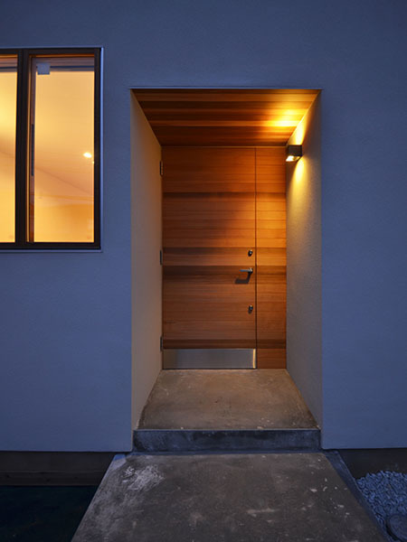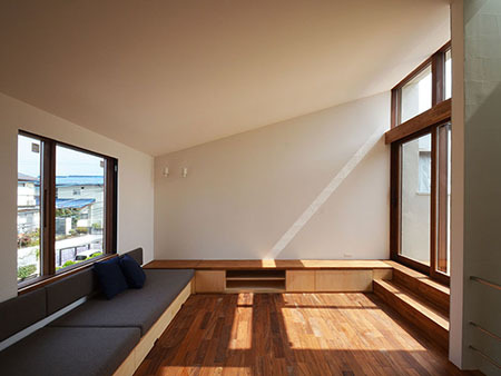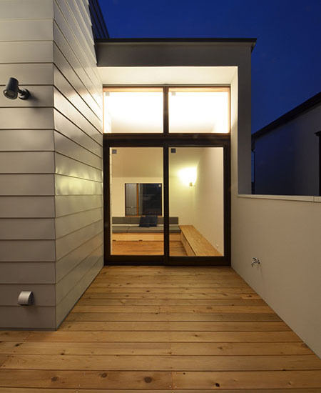 施主のMさんは建築デザイン全般に対する造詣が深く、空間に対する光のあり方に鋭敏で、よってこんなちょっと変わった?空間構成の提案に対しても深くご理解いただき、受け入れていただいたように思います。住まい手はそんな方でしたので、ステップアップするデッキテラスや、ピクチャーウインドウ前の造り付けのソファー、木製サッシ廻りの納まりなどの細部に至るまで、こだわりを持って色々なテーマに挑戦した住宅となっています。