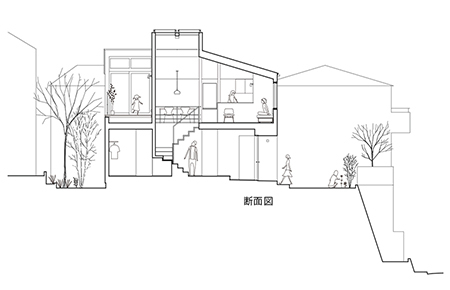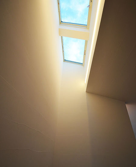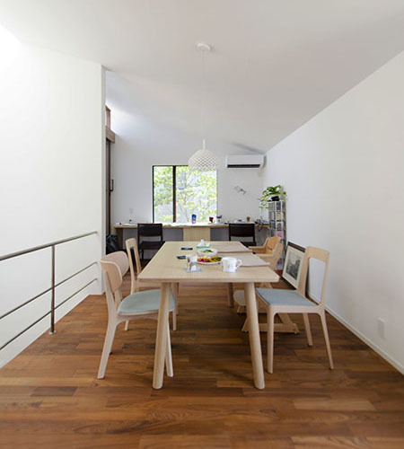通常2階にリビングを置くプランは、明るく開放的なLDKとなる一方で、1階にその分のしわ寄せが生じます。また平面の中央に階段を配する案は、全体の動線がコンパクトに収まる一方で、広々とした空間が確保し難い傾向があります。この住宅ではその両方を採用し、更に階段真上をトップライトにすることなどによって、それらデメリットの解消を試みました。だから一見どこにでもありそうで、あまり見かけないにプランになったかもしれません。