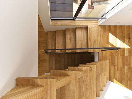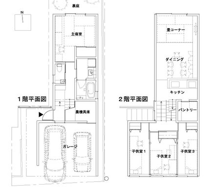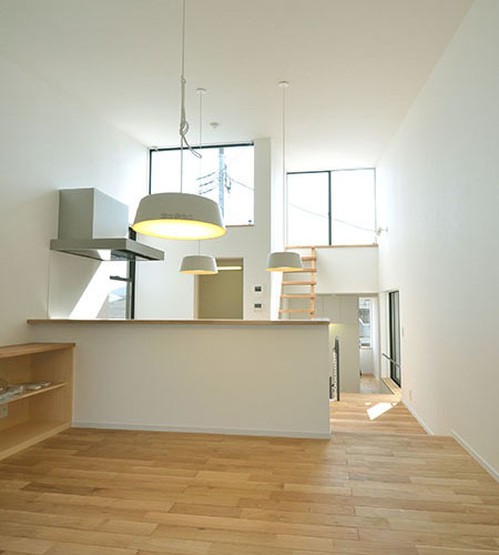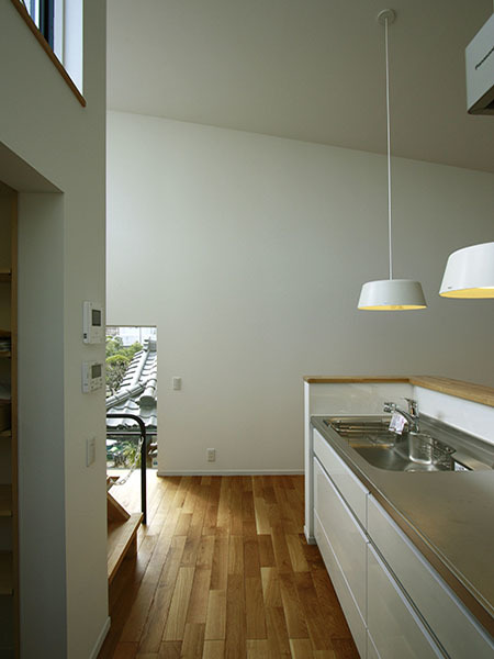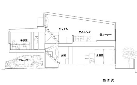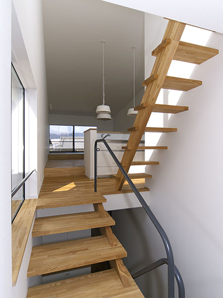 ご実家の土地を分筆して計画するため敷地はかなり変形しており、狭い部分では2間幅。でも現在計画地に建っている2階建てのプレハブ倉庫から見る北側の眺望は美しく(私自身も懐かしい光景)・・・、それを見た瞬間、その場で友人に2階北側をリビングにして大きな窓を設けることを提案。ただし南からの日当たりも得たいのでスキップフロアにして南に高窓を設けて・・・と、構成はあっさり、という感じで決まっていきました。