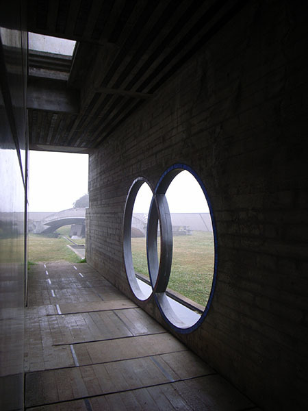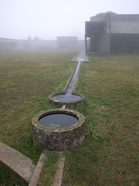 スカルパの数少ない完全設計で、建物の機能の面でも経費の面でもほとんど拘束を受け無かったとのこと。見学の時間帯が、濃い霧に包まれていたこともあり、非常に神秘的な体験でした。スカルパのいつもの建築言語が全体に織り込まれていますが、他作品とは異なりその濃度が極端に高く過剰とも思えるほど。これまでほとんど増改築の設計しかできなかった鬱憤を、遺作ともいえるこの墓碑建築で爆発させたのか。ちなみにスカルパ自身の墓も墓地の一角にあり、そのデザインは息子トビア・スカルパの手によるものです。