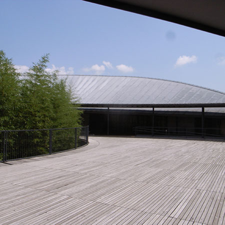 本館入口を入り見上げると湾曲した屋根下の垂木が美しく、棟に向かって徐々に暗がりとなっていく様はさすがに感動ものです。陰影礼賛!別棟の展示館も含め基本的にはこの空間と、滑らかな屋根の稜線が空を切り取る美しさがこの建築の全てではありますが、それはもの足りないとかいうことではなく、それだけで十分ということを言いたいのです。