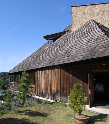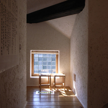 山道を進むと崖の向こうになんとも言えない曲線の屋根が頭を覗かせます。内部も柔らかい空間で優しさに満ちていて、これまたねむの木学園のこともたちの絵にふさわしい。他の藤森建築が「ガザッ」とした手触りであるのに対し、これは「ヌルッ」という感じ。