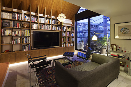 そんな中でも一番の特徴は2階リビング北全面の本棚と、その上部斜めの吹抜けと空間と言えるでしょう。その東面には三角形のままの大窓を設置、東面には時間帯により天窓から一筋の自然光が降り注ぎます。また、勾配天井にはチーク材を張ることでこの住宅の中心であることを示す意図があり、更に3階の主寝室もこの吹抜に面して大きな引戸を設けているために、開け放てば3階でも木の質感と、吹抜の開放感の両方を享受できるという仕組みです。
