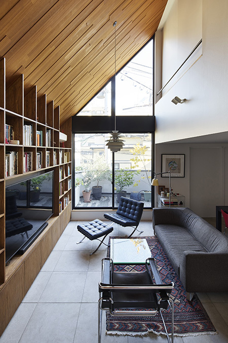 建物密度の高い都会の中でも、この吹抜空間や三角窓を介して、空を感じる生活が営まれることを望んでいます。
