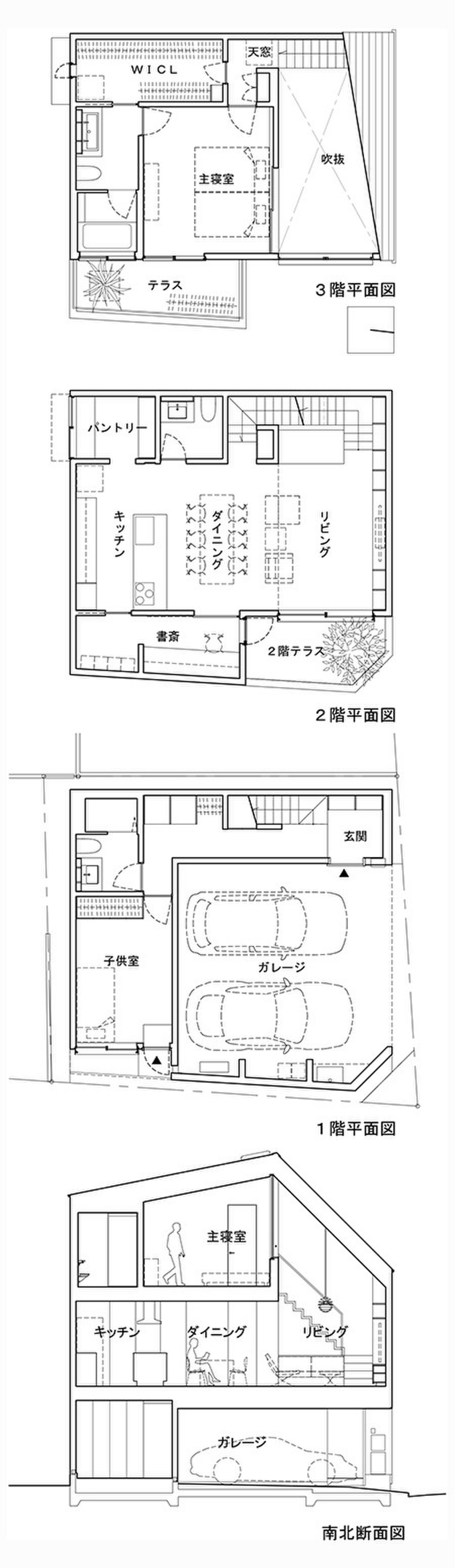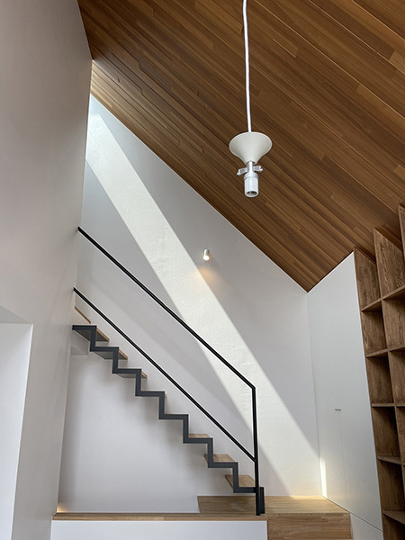 そんな中でも一番の特徴は2階リビング北全面の本棚と、その上部斜めの吹抜けと空間と言えるでしょう。その東面には三角形のままの大窓を設置、東面には時間帯により天窓から一筋の自然光が降り注ぎます。また、勾配天井にはチーク材を張ることでこの住宅の中心であることを示す意図があり、更に3階の主寝室もこの吹抜に面して大きな引戸を設けているために、開け放てば3階でも木の質感と、吹抜の開放感の両方を享受できるという仕組みです。