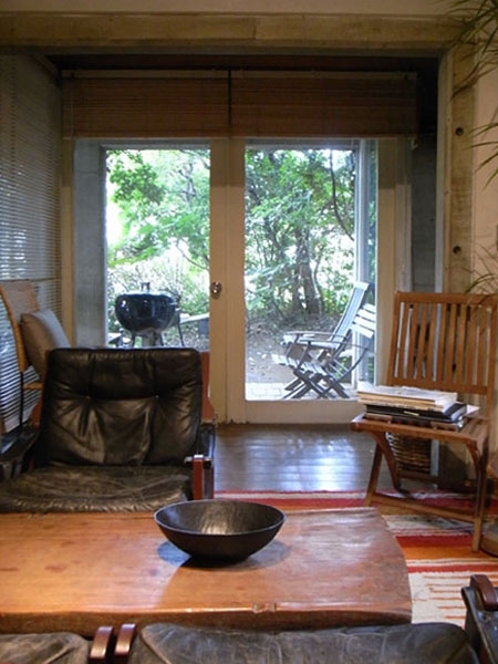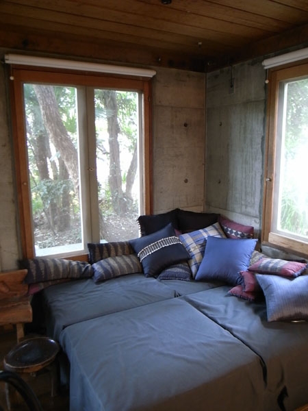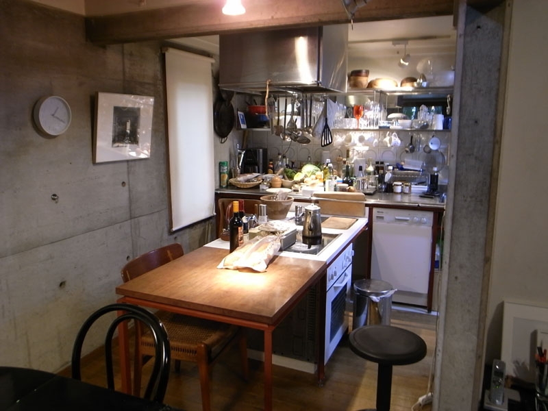 まずは外から、住宅街の一角に森があリ、そのすみ切り部分だけコンクリートの外観が垣間みられるという慎ましい佇まい。続いて中へ、ほとんど丸暗記しているプランがそこに広がっているわけですが、予想通り暗い…。これ、悪い意味では全然なくて、この暗がりが身体的な居心地の良さを醸し出していると思うのです。そしてキッチン、コージーコーナー、アトリエ奥のデイベッドなど、建築雑誌の写真に穴が開くほど凝視したシーンが現実にそこに・・・感無量!