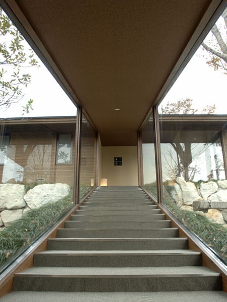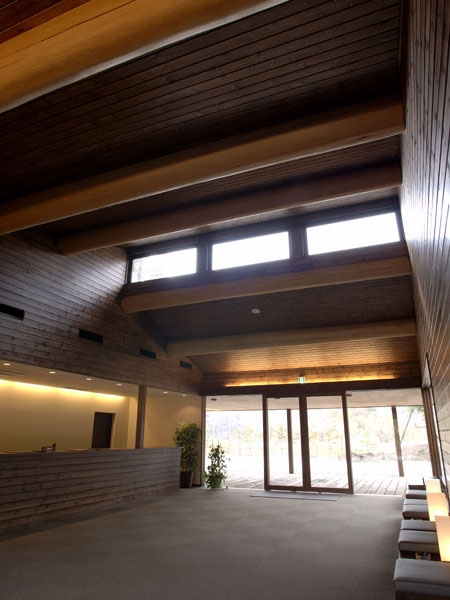 オーナーの要望は「山荘のようなクラブハウス」ということでした。そのためには建物のボリューム感をできるだけ小さく押さえることがポイントですが、そうはいってもゴルフのクラブハウスはそれなりの面積が必要になります。結局、フロントや事務、ロッカーと浴室、レストランという機能ごと3棟に分け、渡り廊下やブリッジで繋ぐという構成に行き着きました。