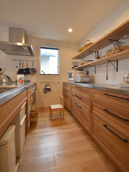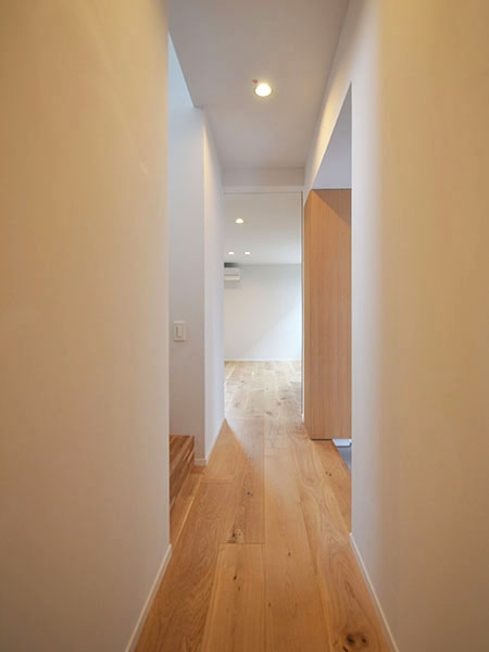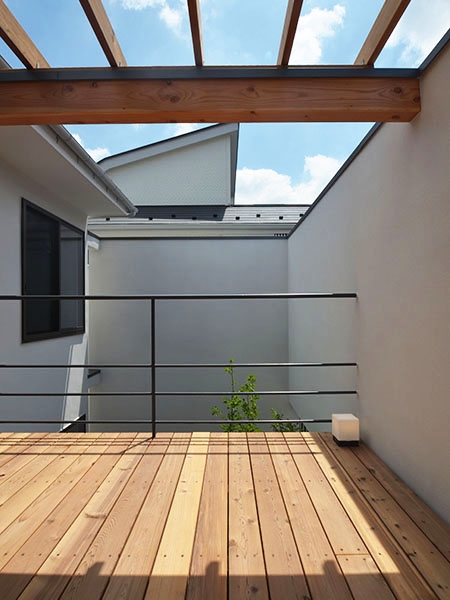 中庭とデッキテラスをL字型に囲む立体コートハウスで、LDKのみならず1階寝室や土間玄関からも、塀で囲われた中庭を介して採光、通風、そして緑の眺望を享受することができます。またL・D・Kは異なる天井高とするなど、家全体の空間は緩やかにつながりながらも抑揚のある構成となっています。