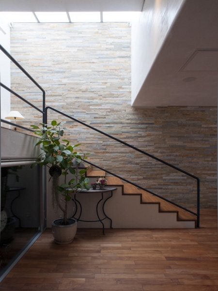 施主のSさんに最初にお会いした時、いただいたリクエストの中で印象的だったコメントは「理想は平屋」ということ。もちろん敷地や諸条件から物理的にそれは不可能。しかし家族の繋がりを最重要に考え、どこにいても家族の気配が感じ取れることを熟考した結果、全体を1/3 層づつずれるスキップフロアとして、空間のシークエンスを最大限に活かした構成に、また、その延長で、階段で上り下りしながら、最終的にはぐるっと家の中を一周できる回遊プランとすることにもなりました。(平面図1階・2階・3階)