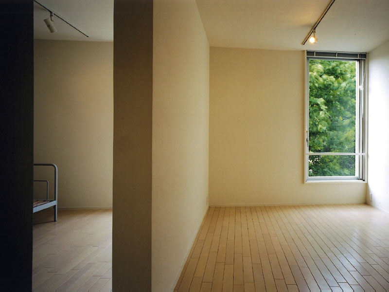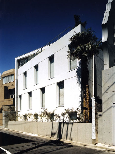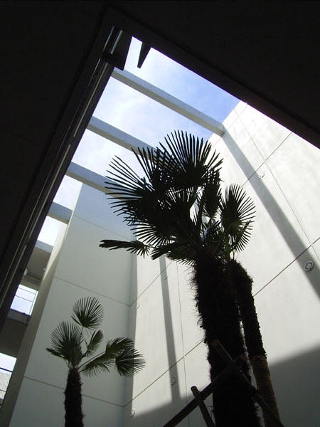 何度もボリュームスタディーを繰り返した結果、東西の道路に面した2棟配置とすることになりました。各住戸は空地の約束された東西側に向けられ、中央には小さな中庭を配しています。この建築は単なるマンションではなく、同じ会社の人間が集まって住むという状況から、中心となるような場所が必要と考えたことも、こういう構成となった理由のひとつです。その中庭にはもともとこの敷地内で植えられていたヤシの木が移植され、現在も育っています。